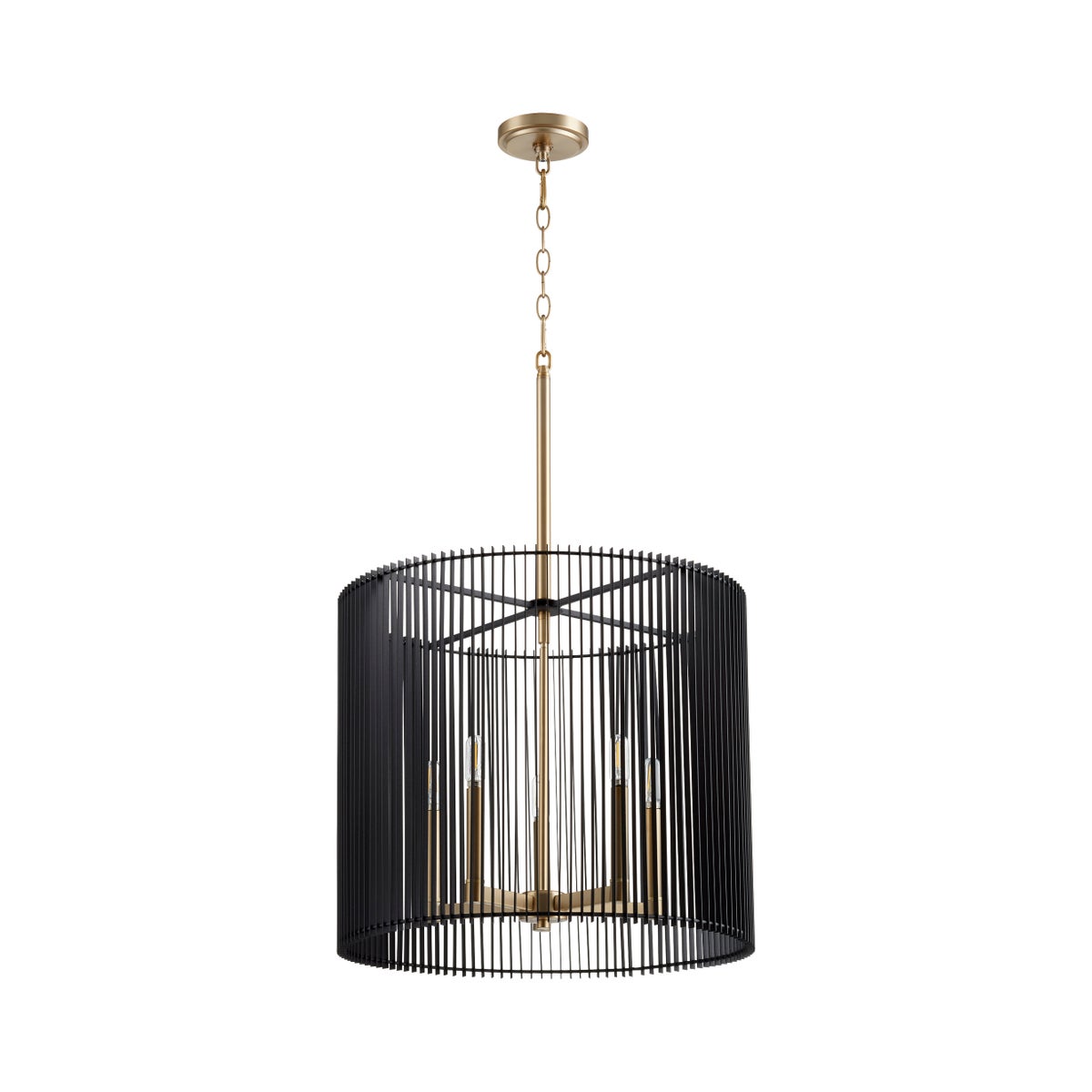 The Finura five-light drum pendant is a geometrically inspired fixture guided by linear composition and an open-aired design. An elegant interplay between the horizontal strips of Noir that surround the fixture and the Aged Brass finish that completes the frame. Featuring a stem and chain hung design, this fixture comes included with supplementary chain and rod stems for customization and adjustability. Fit for candelabra base bulbs, the light source within the drum provides an ambient glow perfect for any en vogue modern-industrial look.